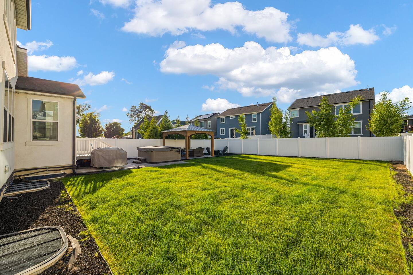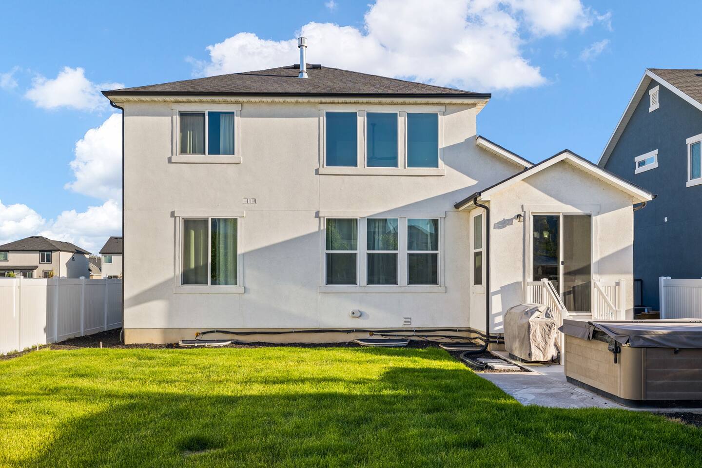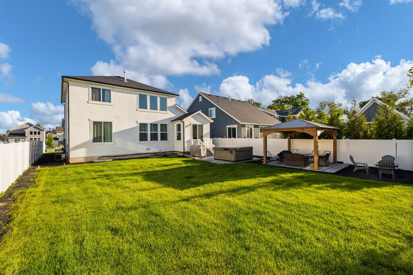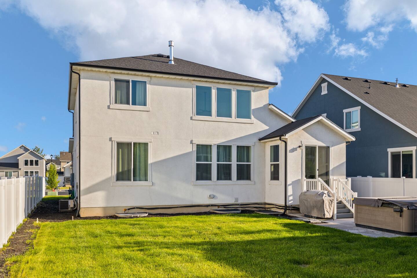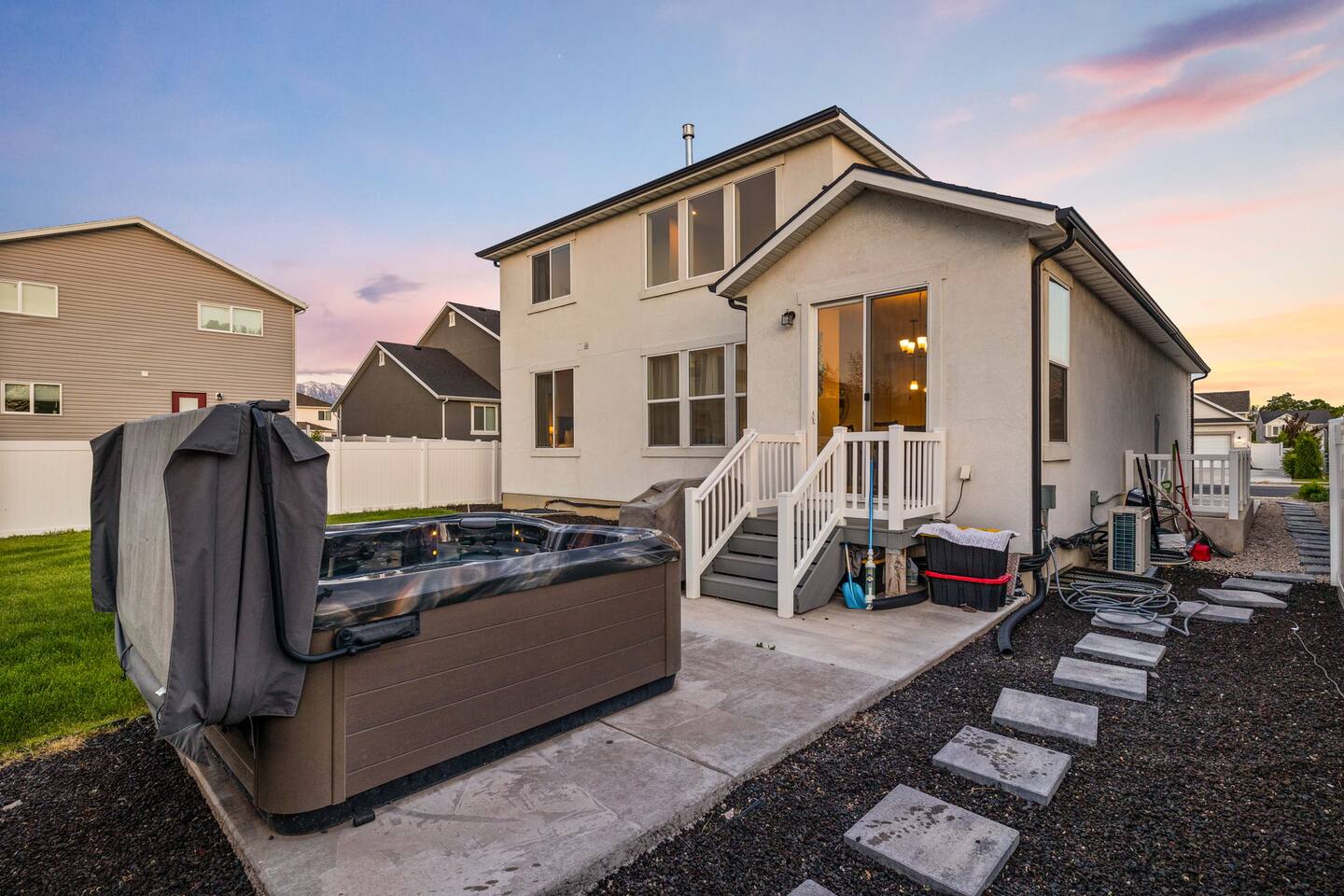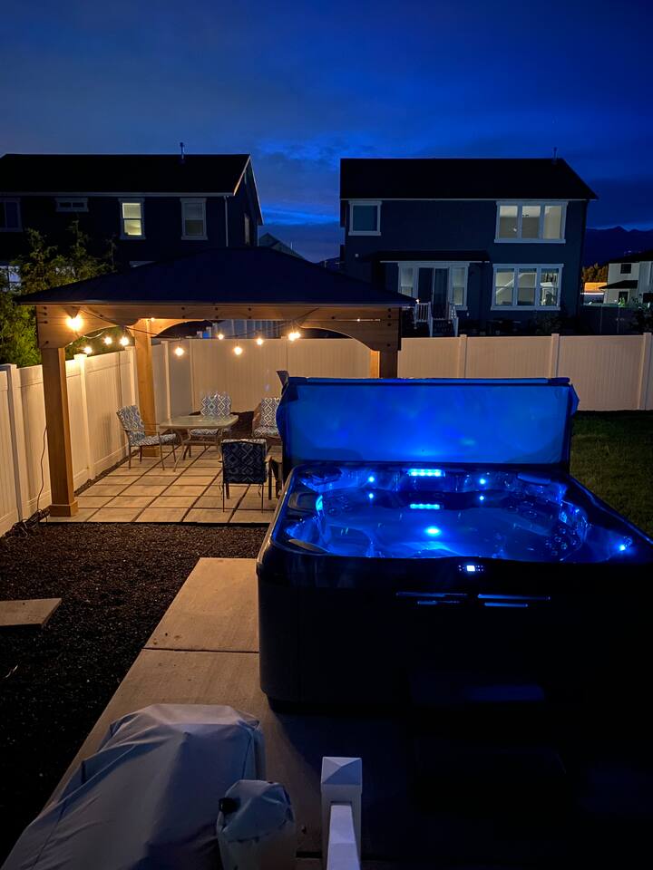 This very centrally located home in American Fork will have everything your family needs from comfort to convenience. The property is within 2 miles of major shopping centers with many dining options as well. Enjoy a fully stocked beautiful kitchen, and an open layout for family gatherings. There is an additional kitchen and living room in the basement which is perfect for larger groups. The outdoor area with a covered patio dining space and hot tub is a perfect place to relax and unwind.
