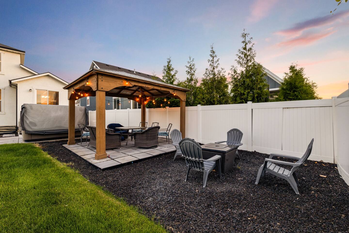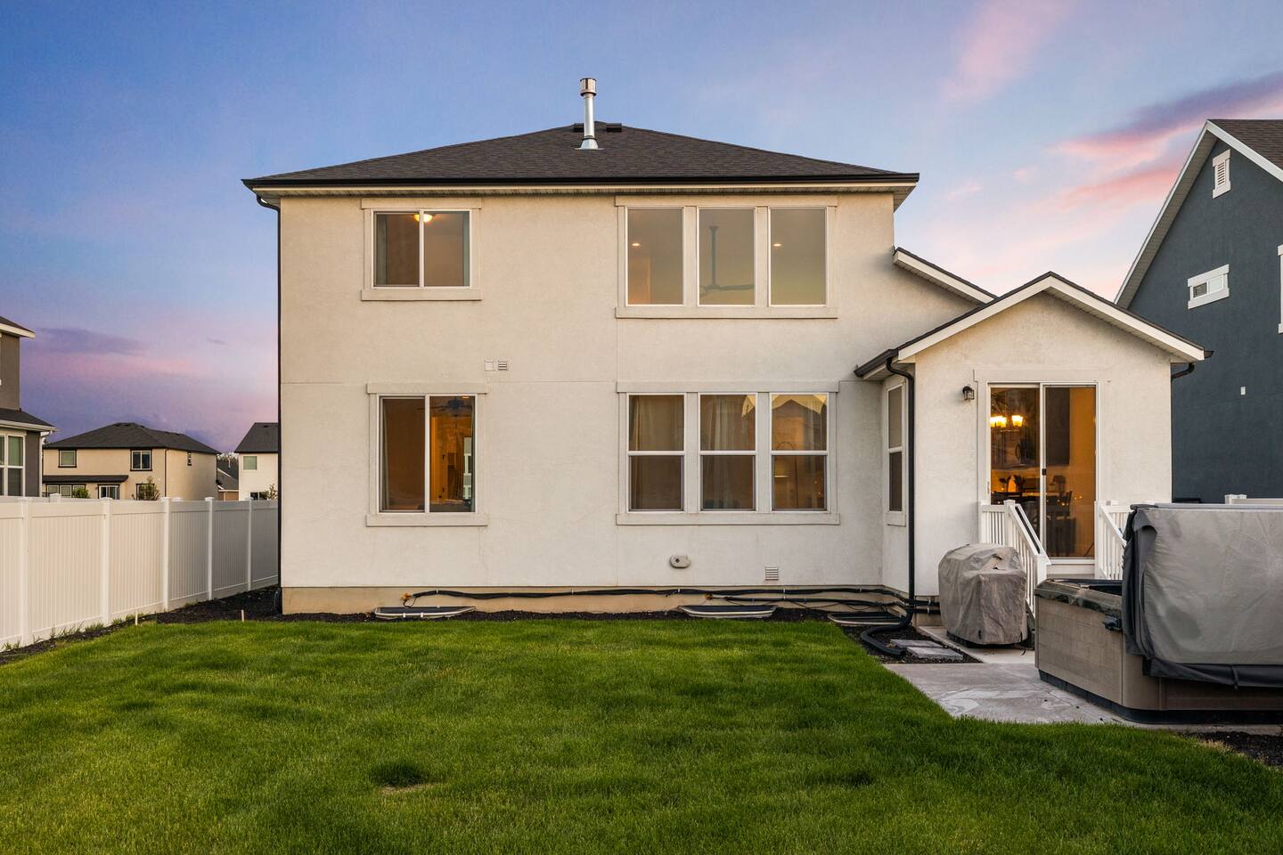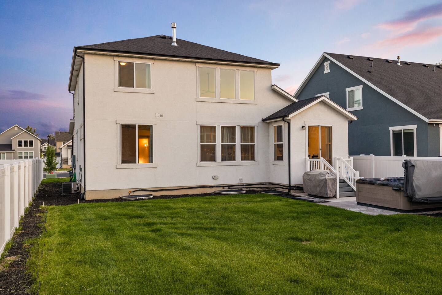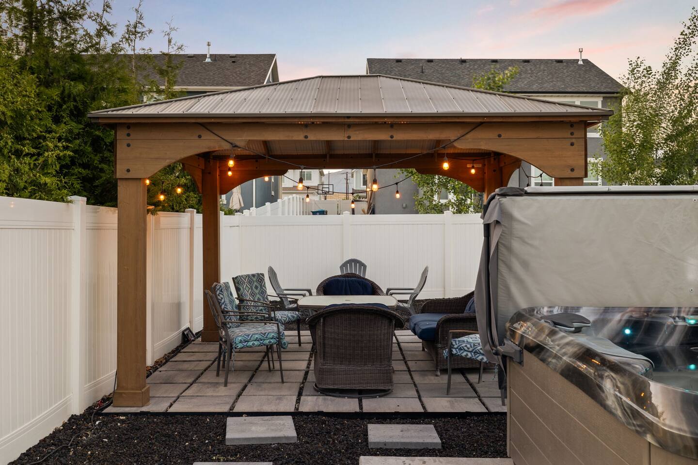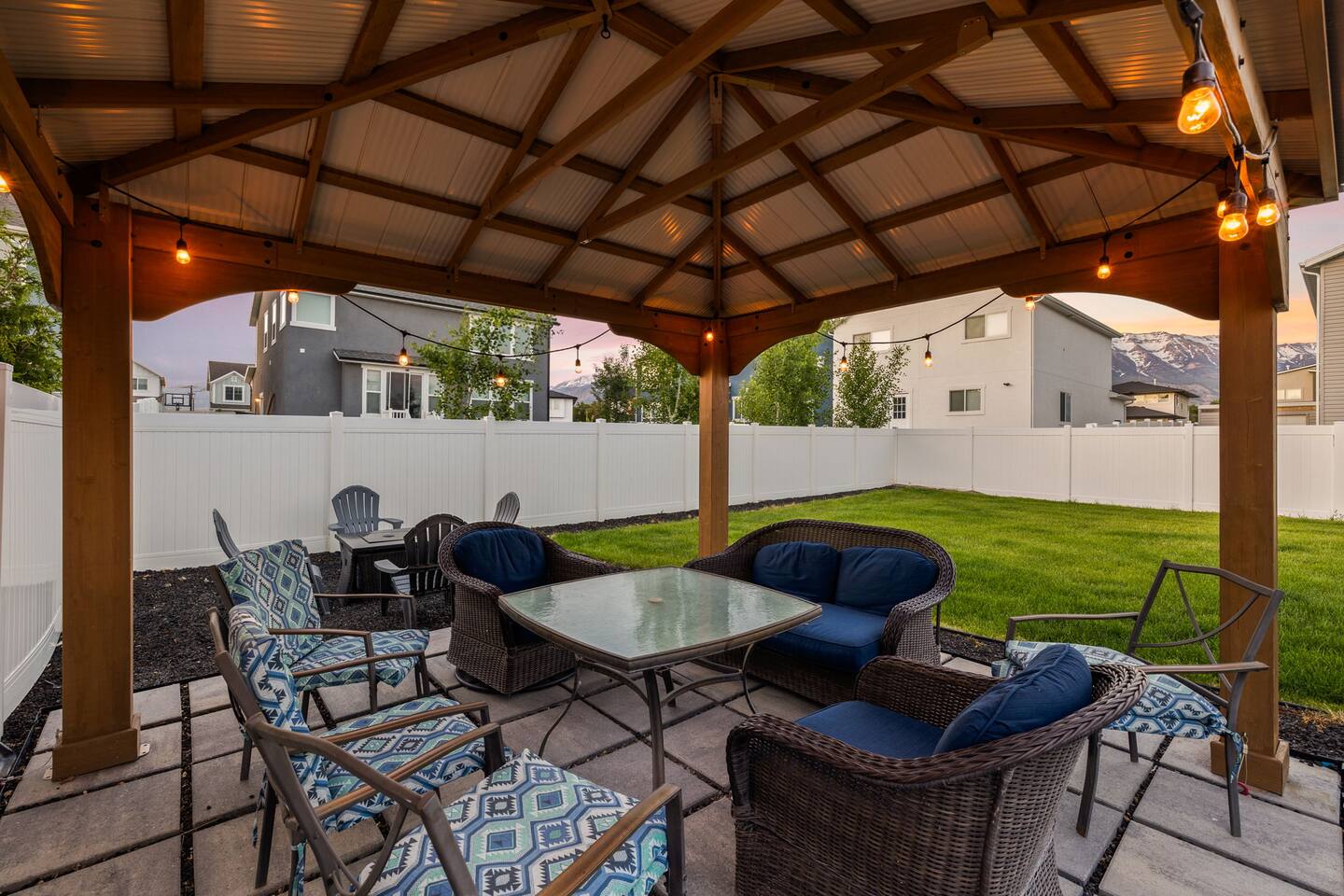This very centrally located home in American Fork will have everything your family needs from comfort to convenience. The property is within 2 miles of major shopping centers with many dining options as well. Enjoy a fully stocked beautiful kitchen, and an open layout for family gatherings. There is an additional kitchen and living room in the basement which is perfect for larger groups. The outdoor area with a covered patio dining space and hot tub is a perfect place to relax and unwind.