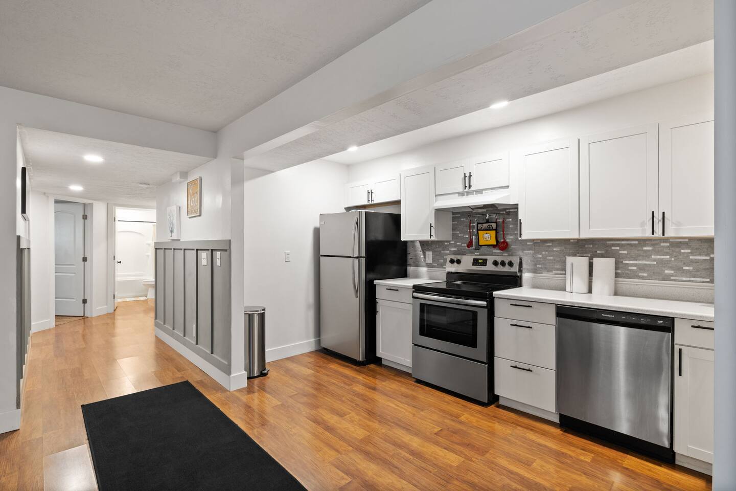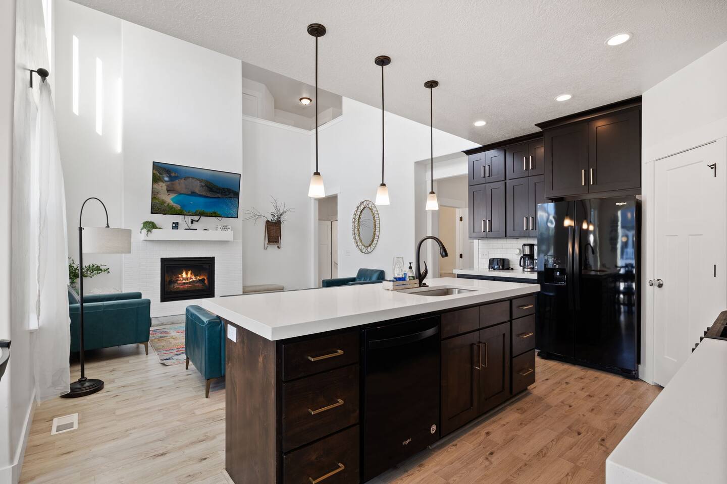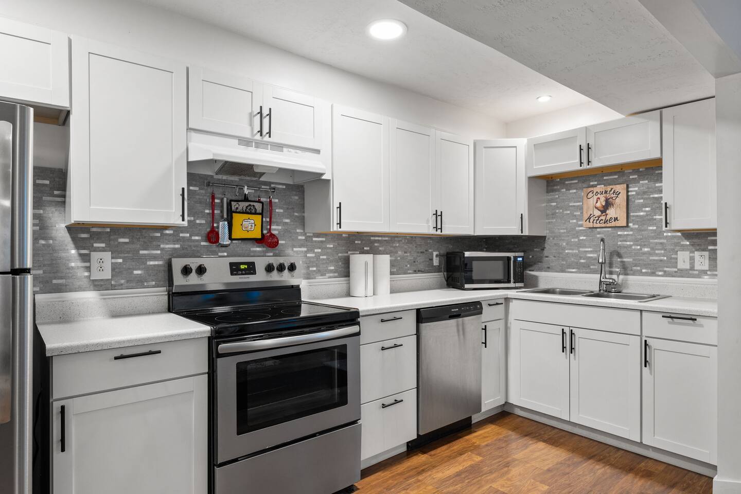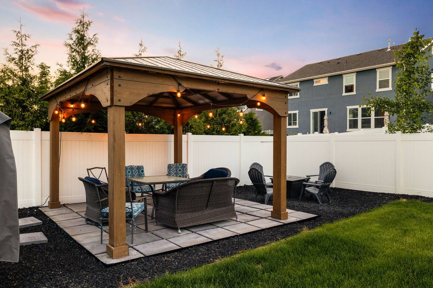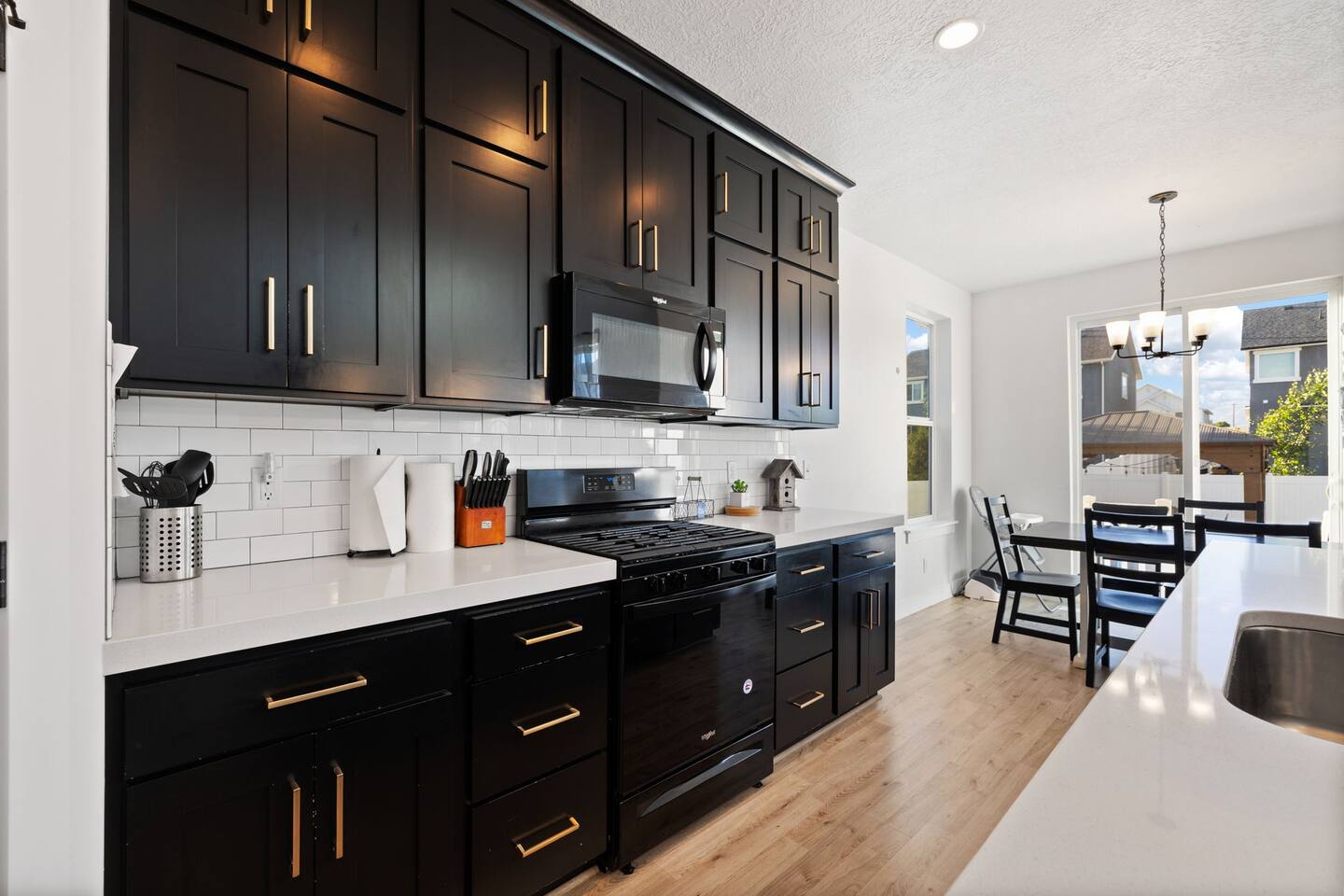 This very centrally located home in American Fork will have everything your family needs from comfort to convenience. The property is within 2 miles of major shopping centers with many dining options as well. Enjoy a fully stocked beautiful kitchen, and an open layout for family gatherings. There is an additional kitchen and living room in the basement which is perfect for larger groups. The outdoor area with a covered patio dining space and hot tub is a perfect place to relax and unwind.