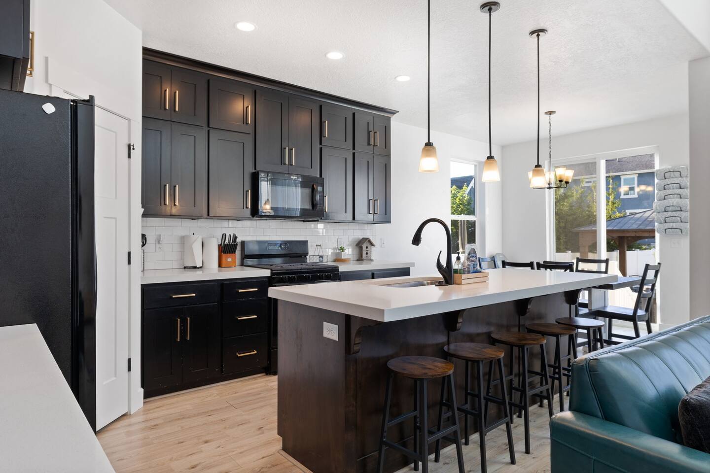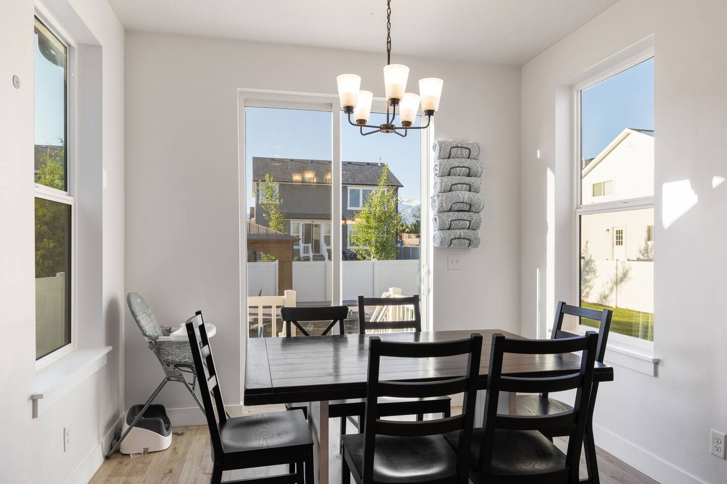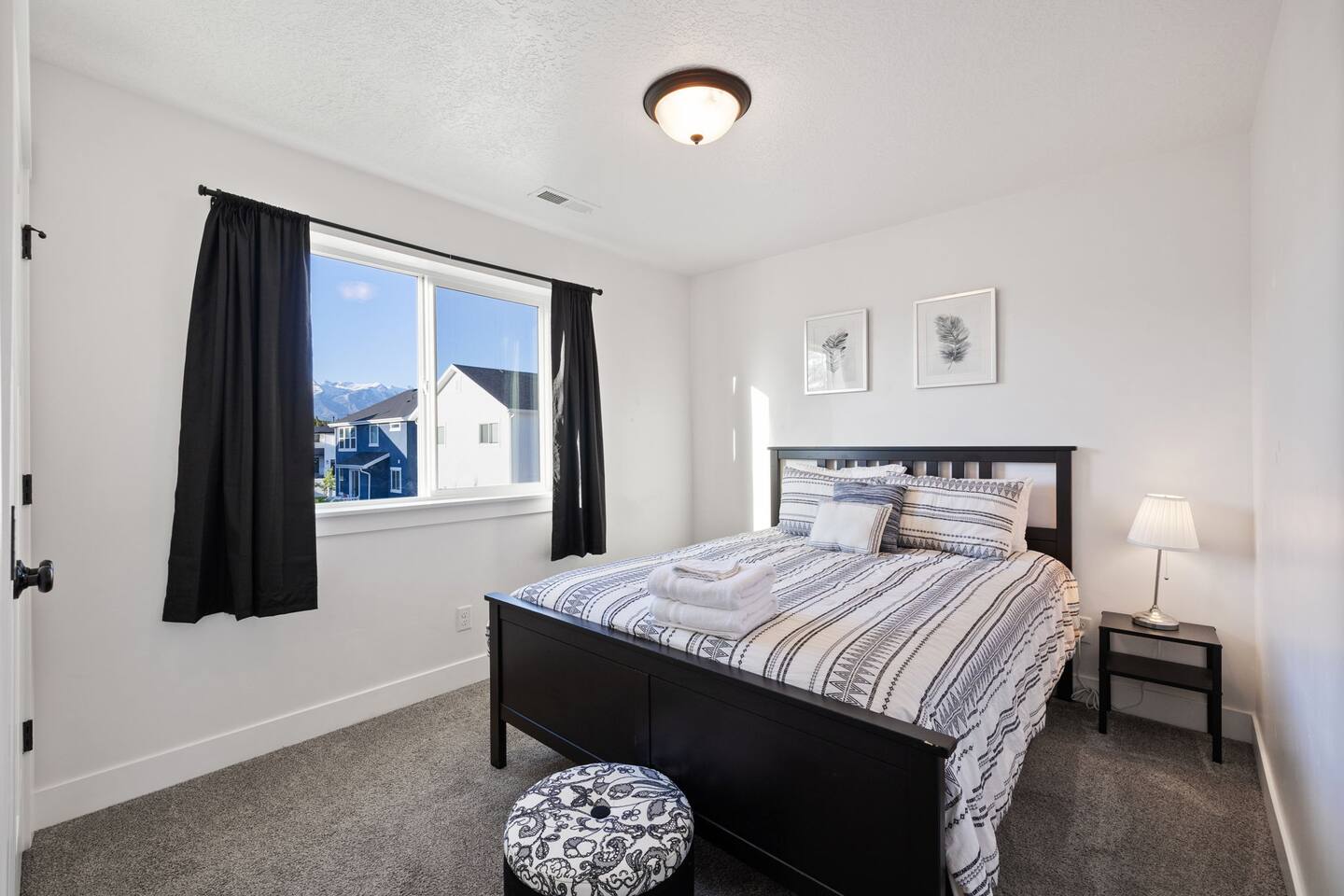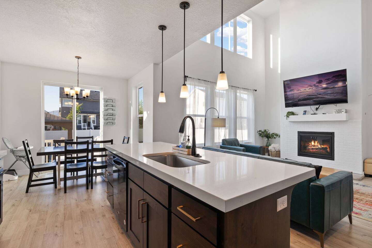 Living Area & Kitchen: The kitchen, living room, and dining room are all connected and are the heart of the home for gathering, eating, and creating memories. The kitchen is fully stocked and has an island with seating for 4 people. Towards the back of the home, you will find the dining table that seats 6 and provides access to the backyard. The living space has a 70" TV over the fireplace surrounded by a stylish couch and two (2) armchairs. The kitchen is stocked with all necessary appliances including a waffle maker and coffee maker. You’ll also find sufficient dish ware and utensils for large groups. The basement also has a fully stocked kitchen and dining area with seating for 6 people. Exterior: The home has a front and backyard available to guests. Outside the back door there is a small patio area with a gas grill available to guests and a hot tub. There is also an outdoor dining area with a gazebo. Bedrooms: The master bedroom is located on the ground floor and has a king bed just off from the living space. There is an attached bath with jetted tub and a separate shower. A large walk-in closet provides plenty of space to store your luggage and a workstation with a large desk and chair. On the second level of the home up a flight of stairs, there are three (3) bedrooms with one (1) queen bed in each. Each bedroom has its own closet. The top three bedrooms share a bathroom that is located on the second level. The basement has two (2) bedrooms. One has a king sized bed and the other has a bunk bed and a desk for another working space. Bathroom(s) & Laundry: On the main level in the master bedroom, there is a large dual sink bathroom with a shower, separate jetted tub, and toilet. On the second level, there is a single sink bathroom that has a secondary door that separates the shower/tub and toilet from the sink and vanity. In the basement, there is a single sink bathroom with shower/tub and toilet. There is a washer and dryer located on the main level that is connected to the mudroom as one enters the home from the garage. There is also a 2 in 1 washer/dryer in the basement. Specific Amenities: The guests will have full access to a 2-car enclosed garage equipped with Tesla wall charger. Wi-Fi Speed: Xfinity -- 701.53 Download See images for test results Distances to these local destinations: - Evermore Park -- 10 minutes - Mount Timpanogos Utah Temple -- 10 minutes - Thanksgiving Point -- 10 minutes - Young Living Essential Oils (Global Headquarters) -- 11 minutes - Utah Valley University -- 13 minutes - Utah Lake State Park - 21 minutes - Brigham Young University -- 23 minutes - Sundance Resort -- 32 minutes - Alta/Snowbird ski resorts — 46 minutes (Note: Distance provided by the most popular navigation website)