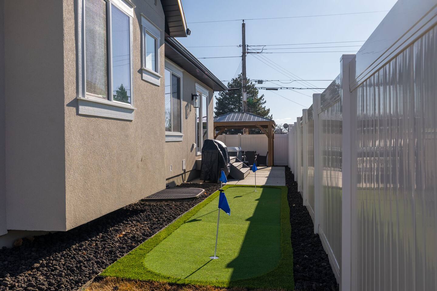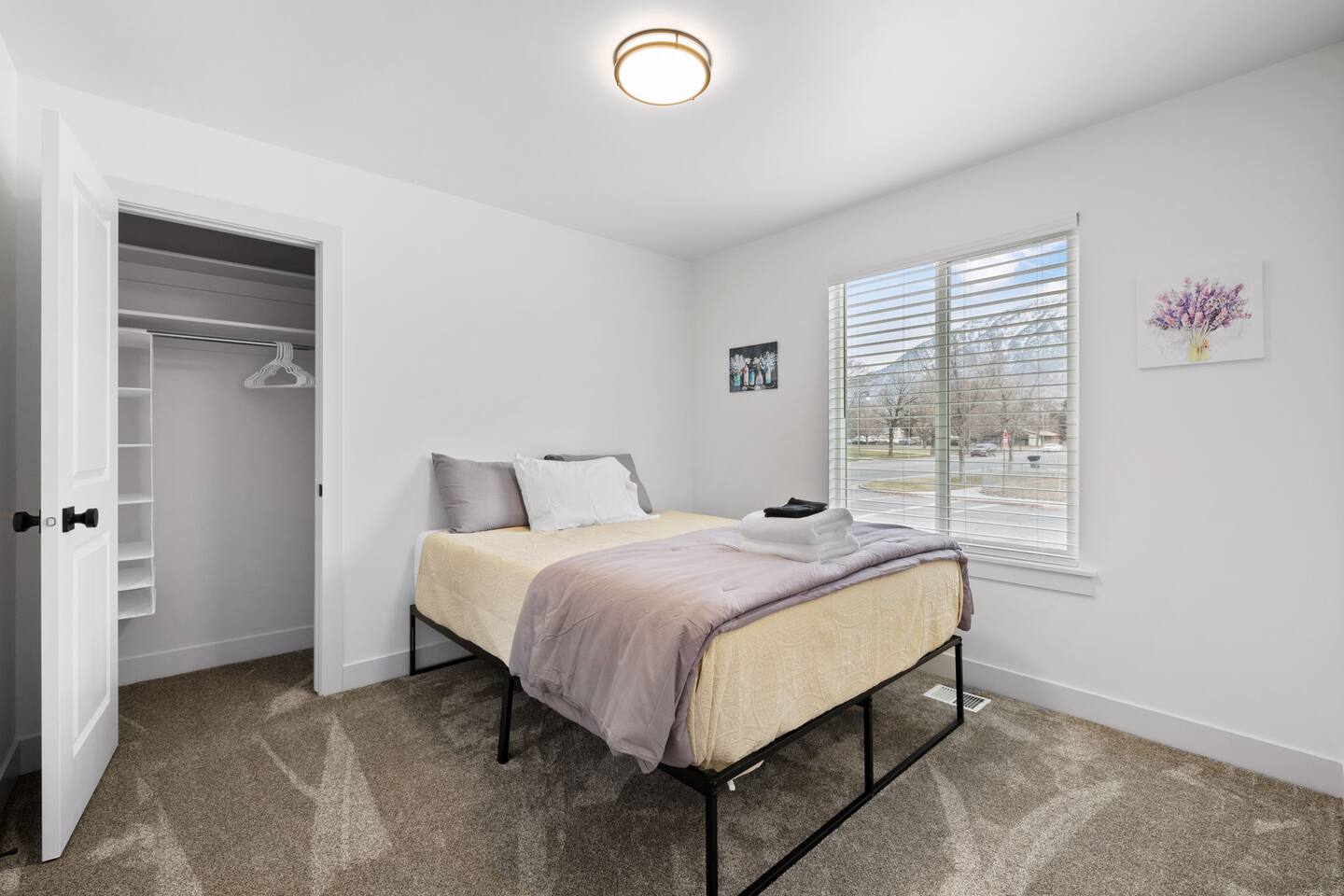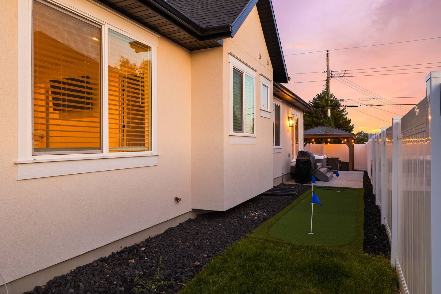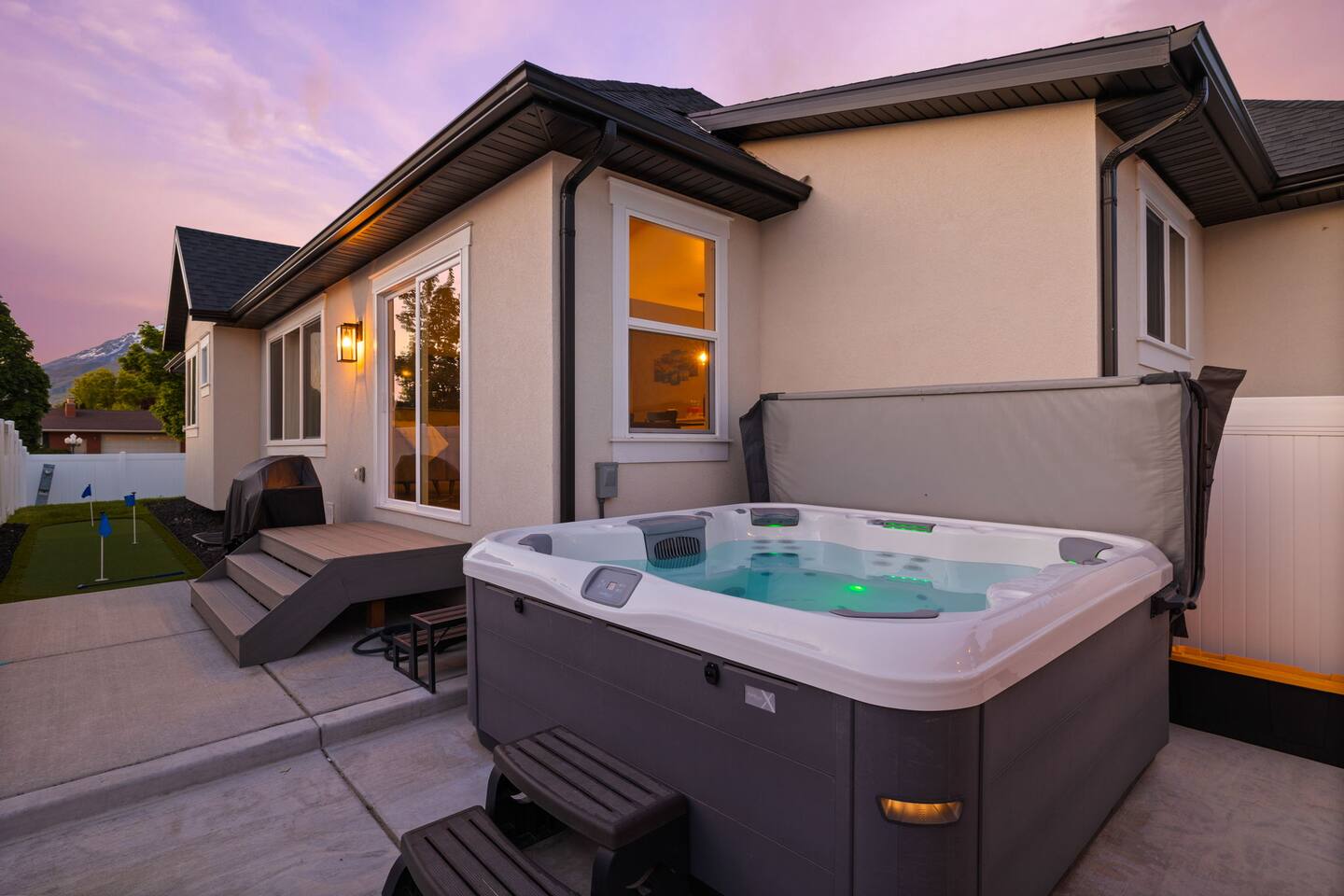 Living Area & Kitchen: The kitchen, living room, and dining room are all connected and are the heart of the home for gathering, eating, and creating memories. The kitchen is fully stocked and has an island with seating for 4 people. Towards the back of the home, you will find the dining table that seats 8 and provides access to the backyard. The living space has a 75" TV surrounded by a stylish couch. The kitchen is stocked with all necessary appliances including a waffle maker and coffee maker. You’ll also find sufficient dish ware and utensils for large groups. Exterior: The home has a front and backyard available to guests. Outside the back door there is a small patio area with a gas grill available to guests and a hot tub. There is also an outdoor dining area with a gazebo and putting green. Bedrooms: The master bedroom is located on the ground floor and has a king bed just off from the living space. There is an attached bath with free standing tub and a separate shower. A large walk-in closet provides plenty of space to store your luggage. There are three (3) other bedrooms with one (1) king bed, one (1) queen, and one (1) queen with full trundle. Each bedroom has its own closet. These three bedrooms share a bathroom that is located across the hall. Bathroom(s) & Laundry: On the main level in the master bedroom, there is a large dual sink bathroom with a shower, separate free standing tub, and toilet. There is also a single sink bathroom with shower/tub and toilet. There is a high capacity washer and dryer located on the main level just off the kitchen. Specific Amenities: The guests will have full access to a 2-car enclosed garage equipped with Tesla charger. Wi-Fi Speed: Xfinity -- 701.53 Download See images for test results Distances to these local destinations: - Evermore Park -- 11 minutes - The Homestead Crater and Heber city — 30 minutes - Mount Timpanogos Utah Temple -- 18 minutes - Thanksgiving Point -- 18 minutes - Young Living Essential Oils (Global Headquarters) -- 17 minutes - Utah Valley University -- 6 minutes - Utah Lake State Park - 17 minutes - Brigham Young University -- 8 minutes - Sundance Resort -- 16 minutes - Alta/Snowbird ski resorts — 50 minutes (Note: Distance provided by the most popular navigation website) Note: - Home is a duplex, the owners live in the basement. All entrances are separate.
