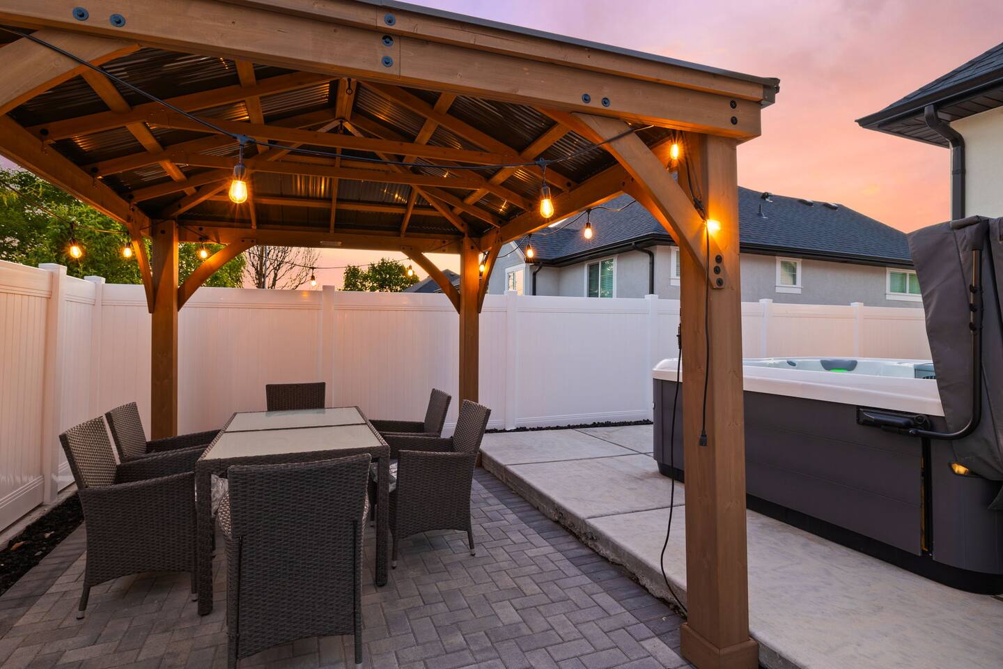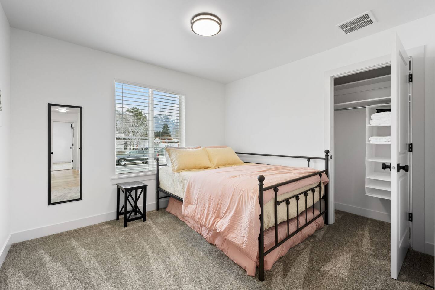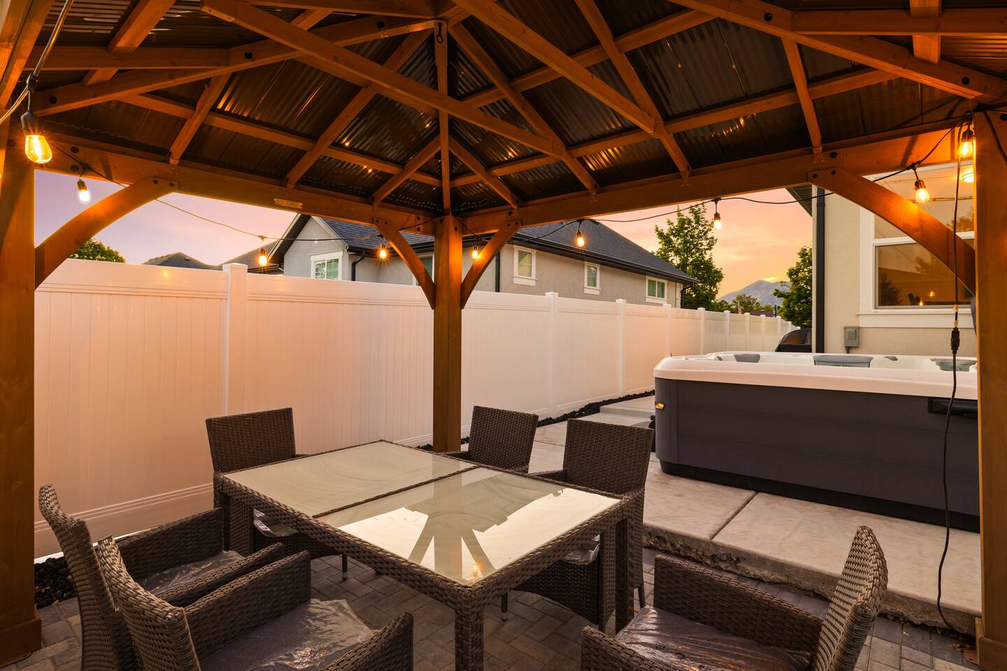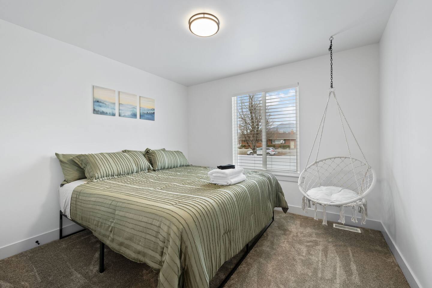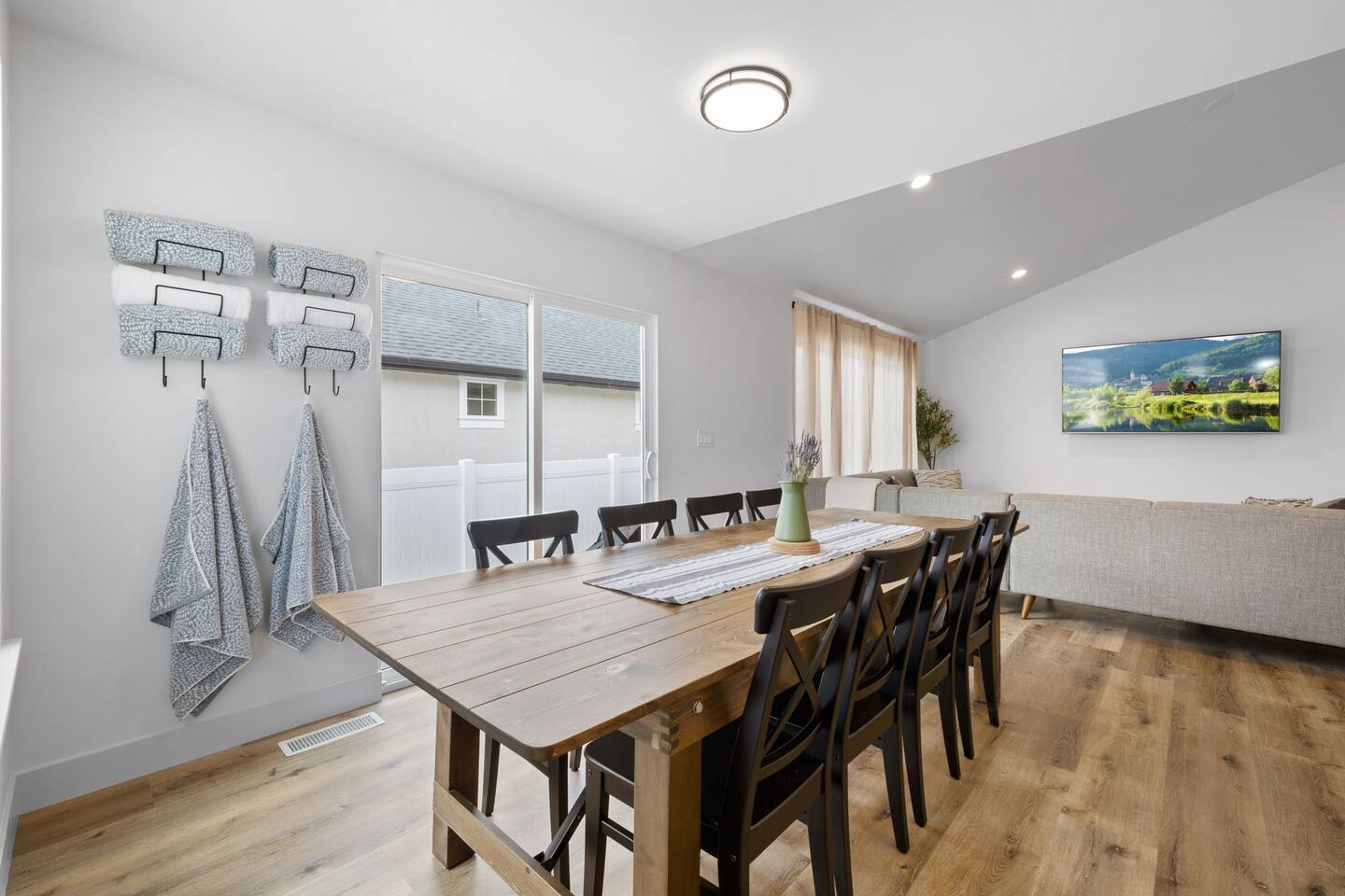 Living Area & Kitchen: The kitchen, living room, and dining room are all connected and are the heart of the home for gathering, eating, and creating memories. The kitchen is fully stocked and has an island with seating for 4 people. Towards the back of the home, you will find the dining table that seats 8 and provides access to the backyard. The living space has a 75" TV surrounded by a stylish couch. The kitchen is stocked with all necessary appliances including a waffle maker and coffee maker. You’ll also find sufficient dish ware and utensils for large groups. Exterior: The home has a front and backyard available to guests. Outside the back door there is a small patio area with a gas grill available to guests and a hot tub. There is also an outdoor dining area with a gazebo and putting green. Bedrooms: The master bedroom is located on the ground floor and has a king bed just off from the living space. There is an attached bath with free standing tub and a separate shower. A large walk-in closet provides plenty of space to store your luggage. There are three (3) other bedrooms with one (1) king bed, one (1) queen, and one (1) queen with full trundle. Each bedroom has its own closet. These three bedrooms share a bathroom that is located across the hall. Bathroom(s) & Laundry: On the main level in the master bedroom, there is a large dual sink bathroom with a shower, separate free standing tub, and toilet. There is also a single sink bathroom with shower/tub and toilet. There is a high capacity washer and dryer located on the main level just off the kitchen. Specific Amenities: The guests will have full access to a 2-car enclosed garage equipped with Tesla charger. Wi-Fi Speed: Xfinity -- 701.53 Download See images for test results Distances to these local destinations: - Evermore Park -- 11 minutes - The Homestead Crater and Heber city — 30 minutes - Mount Timpanogos Utah Temple -- 18 minutes - Thanksgiving Point -- 18 minutes - Young Living Essential Oils (Global Headquarters) -- 17 minutes - Utah Valley University -- 6 minutes - Utah Lake State Park - 17 minutes - Brigham Young University -- 8 minutes - Sundance Resort -- 16 minutes - Alta/Snowbird ski resorts — 50 minutes (Note: Distance provided by the most popular navigation website) Note: - Home is a duplex, the owners live in the basement. All entrances are separate.