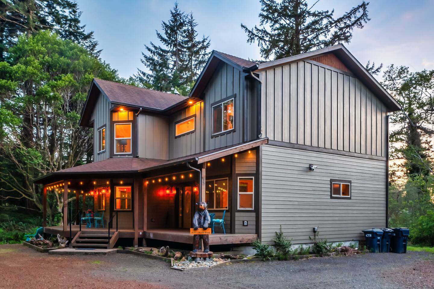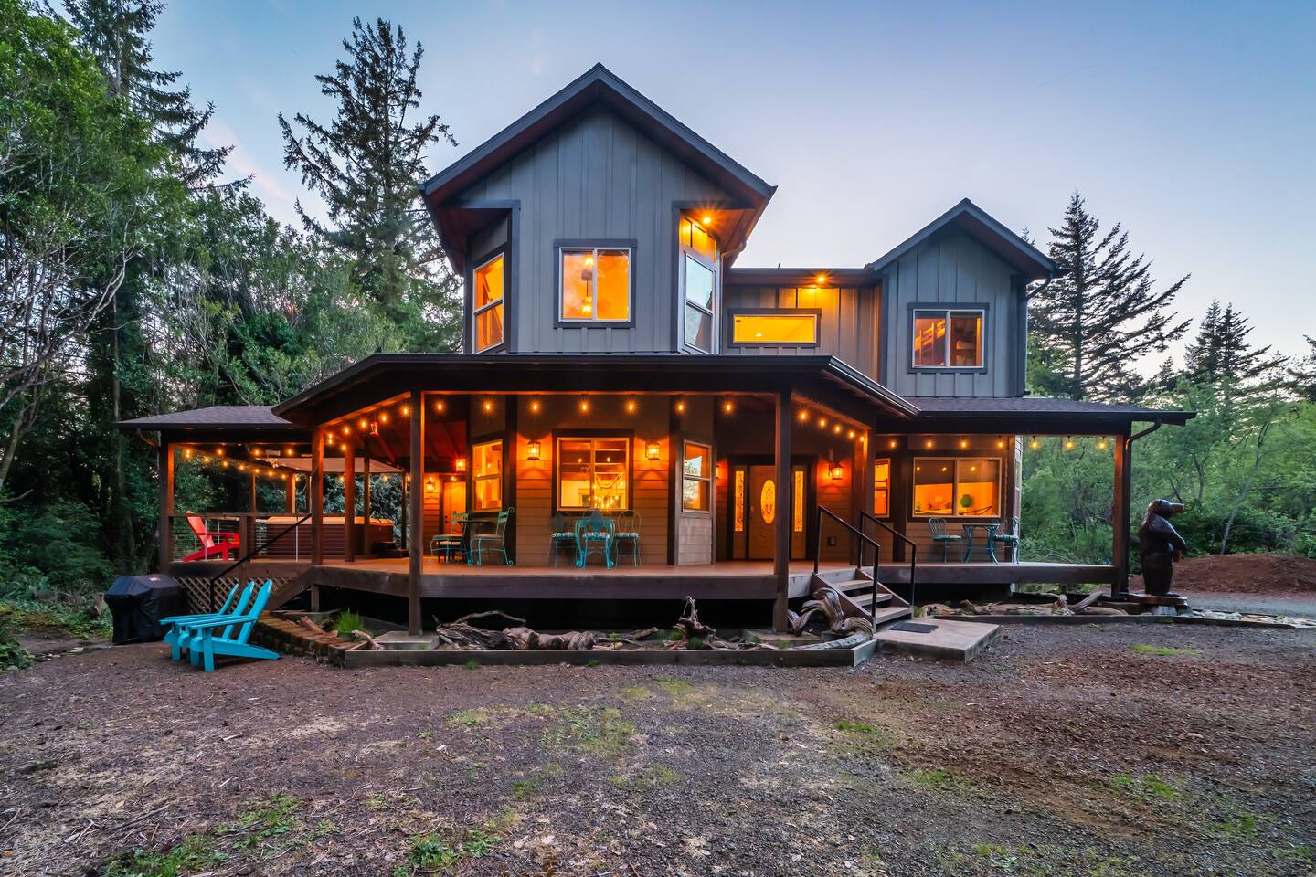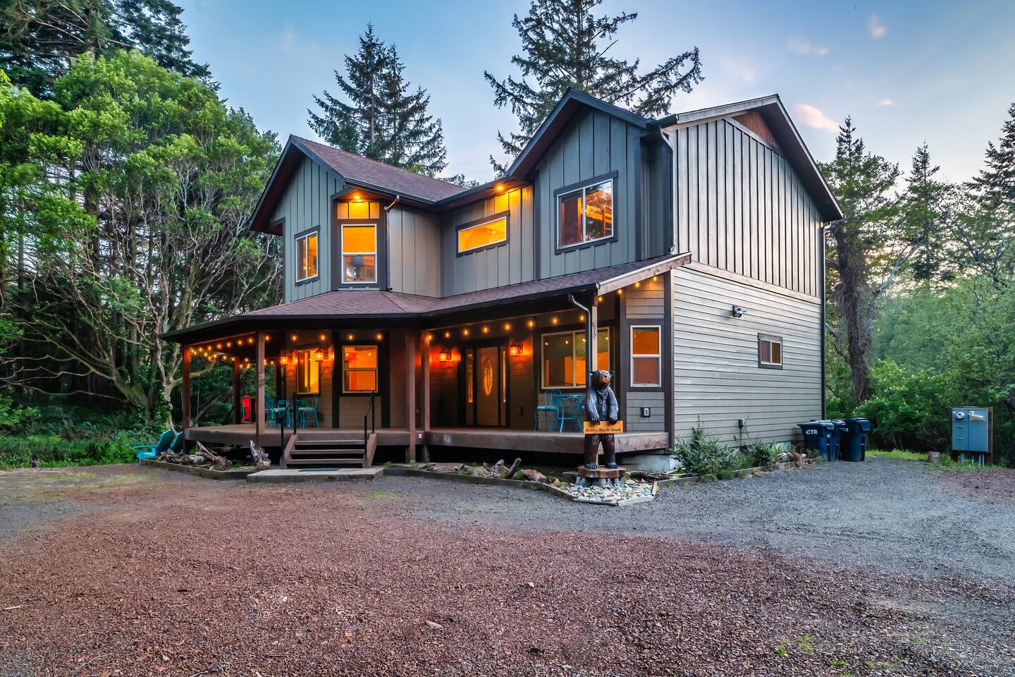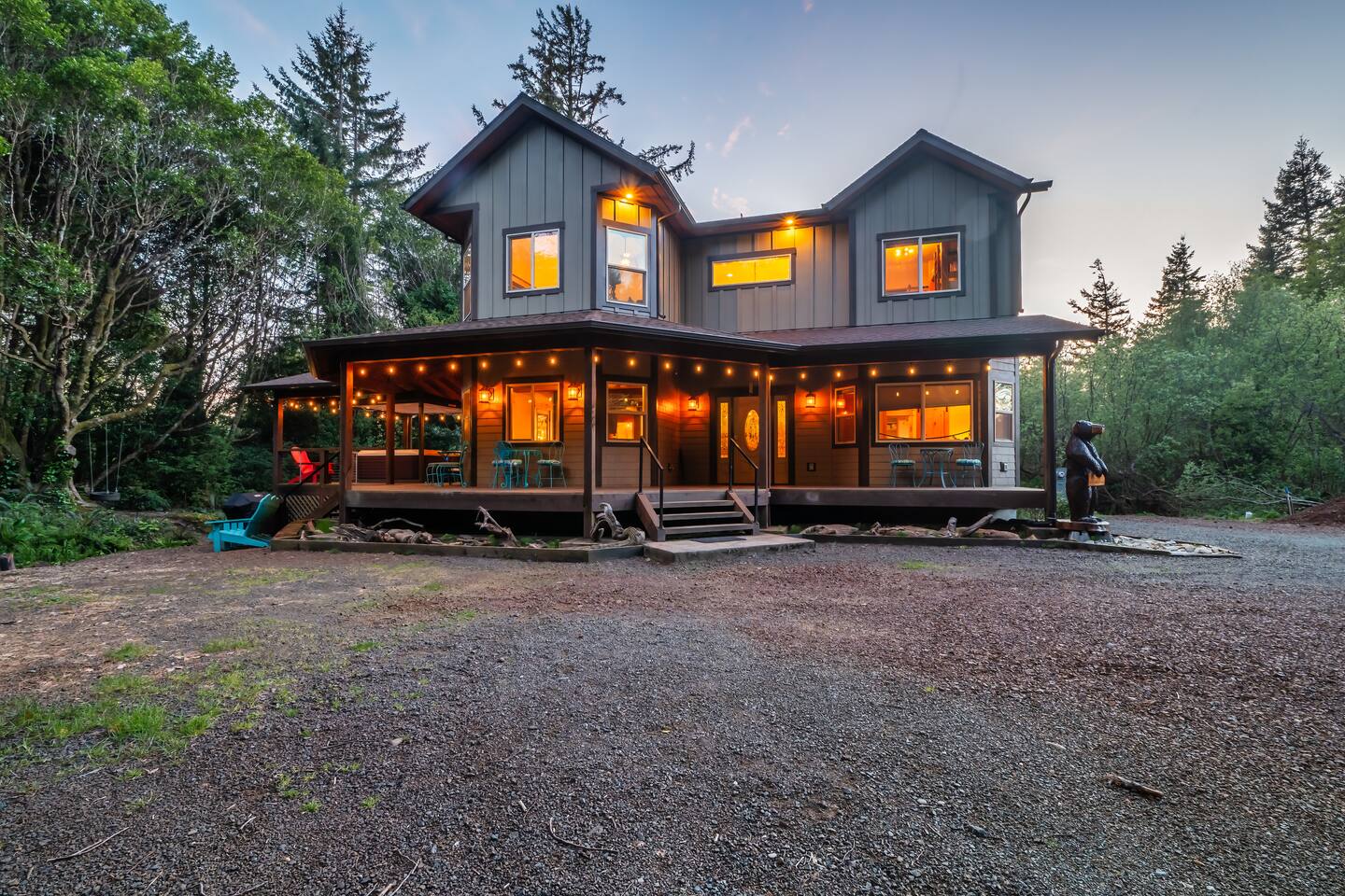 Your immediate surroundings include peaceful woods and a winding creek that comes right by the property. It's a nice place to take your dogs for a walk - they're welcome. To the south lies central Port Orford, with restaurants, art galleries, and a unique dolly port where you can watch the ships travel back and forth. You'll find easy beach access near the Visitor Center in town, as well as at Paradise Point directly to the west. The home even features two RV hook-up pads, so you'll be able to explore the region with ease. A Southern-style wraparound porch takes you to a covered, eight-person hot tub, where you can relax after a long day out. Enjoy heated tile floors back inside as you unwind with free WiFi and the flatscreen TV. You can unwind even more in the game room, or use the kitchen and walk-in pantry to cook up something tasty. The unique triple-bunk room and the upstairs game room with a large TV and a PlayStation 4 are sure to be a hit with youthful travelers. We hope you're as excited for this vacation as we are. Save your dates today! 4 dog(s) are welcome in this home. No other animals are allowed without specific approval. Parking notes: There is free parking for vehicles. Due to local laws or HOA requirements, guests must be at least 21 years of age to book. Guests under 21 must be accompanied by a parent or legal guardian for the duration of the reservation.