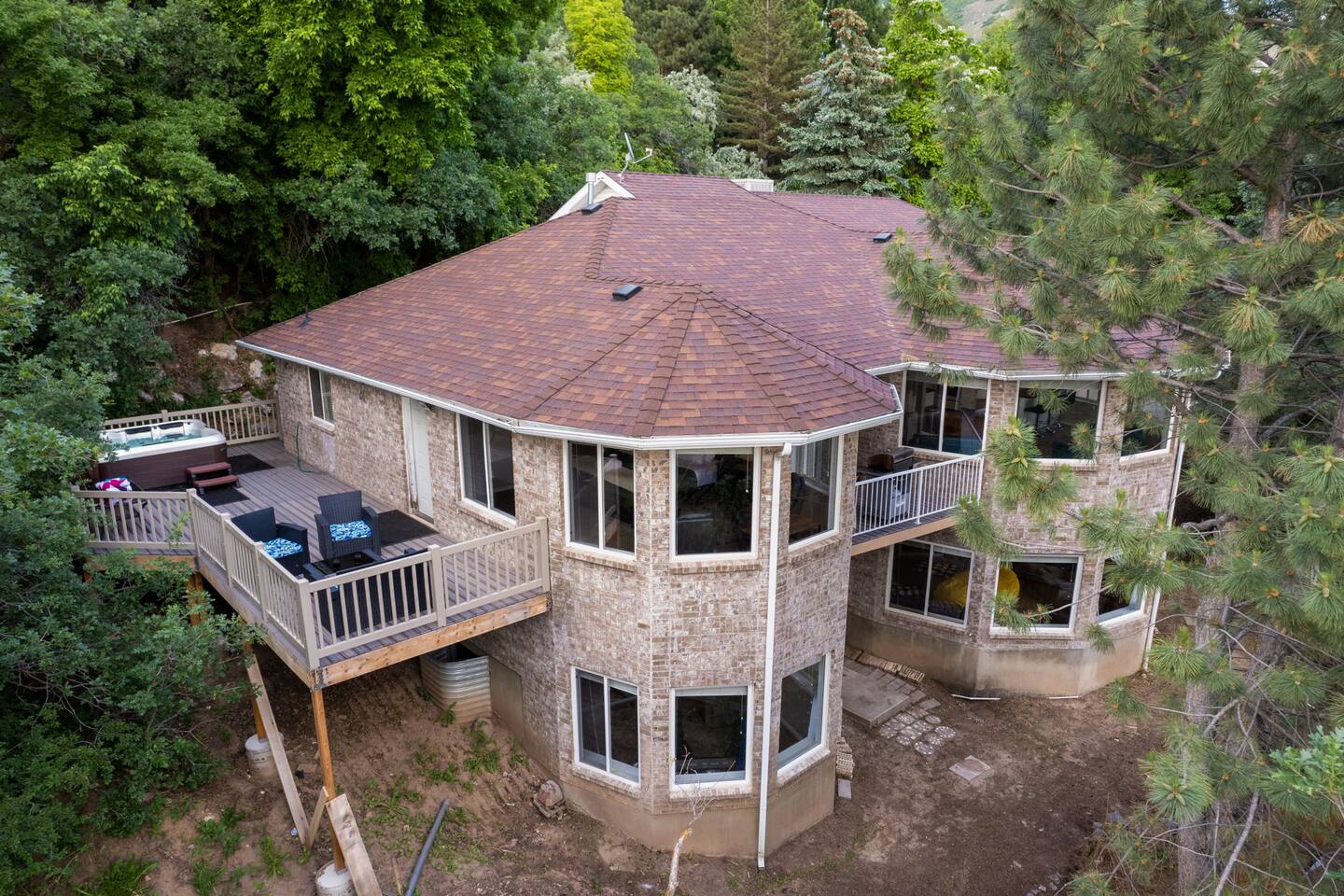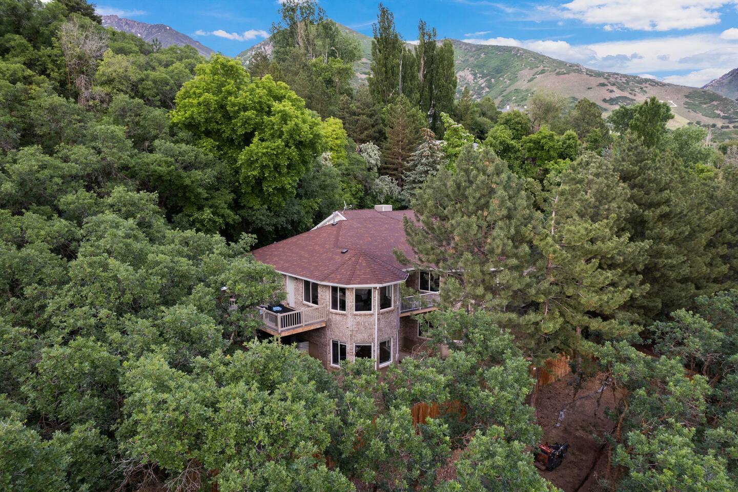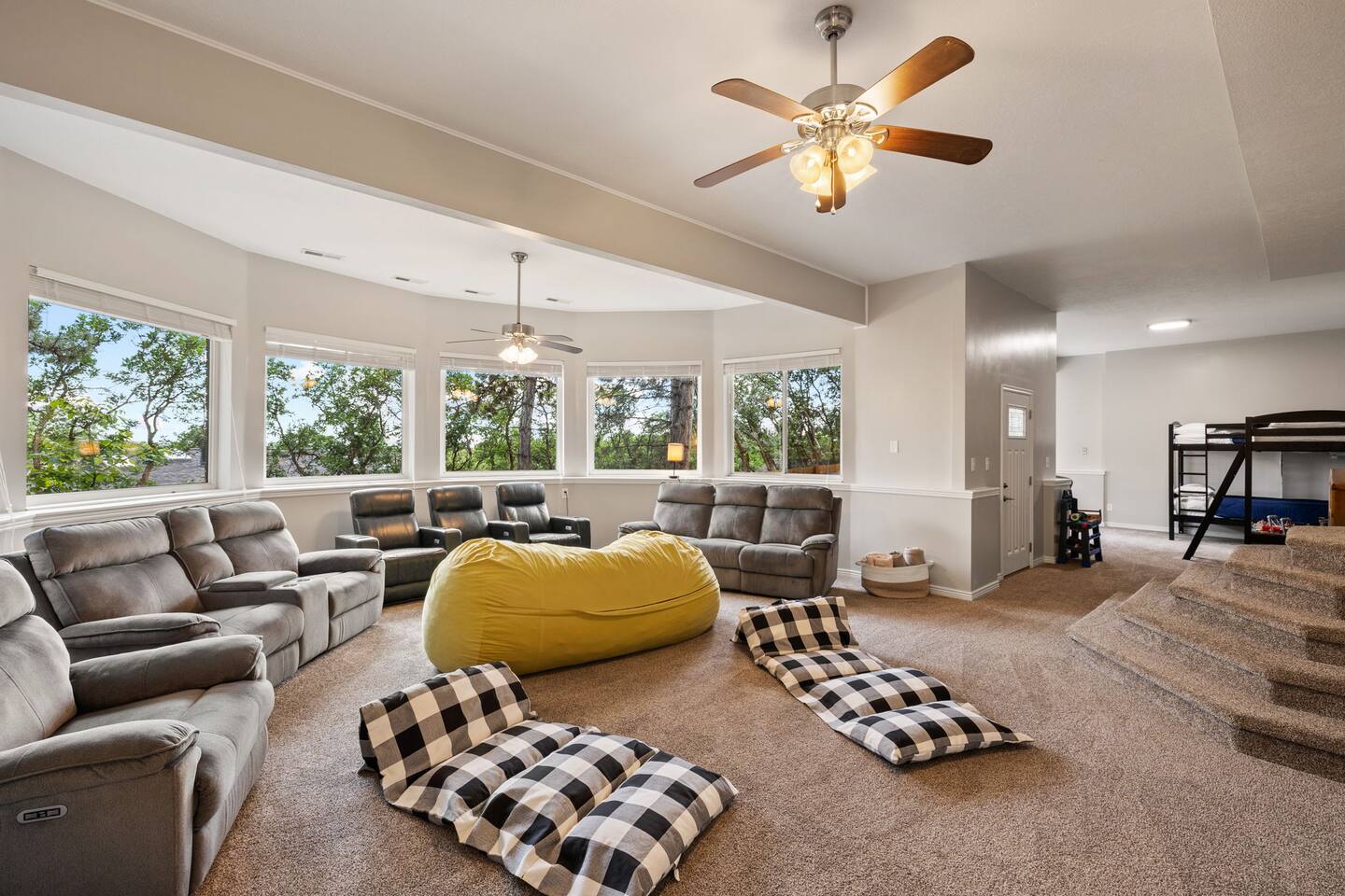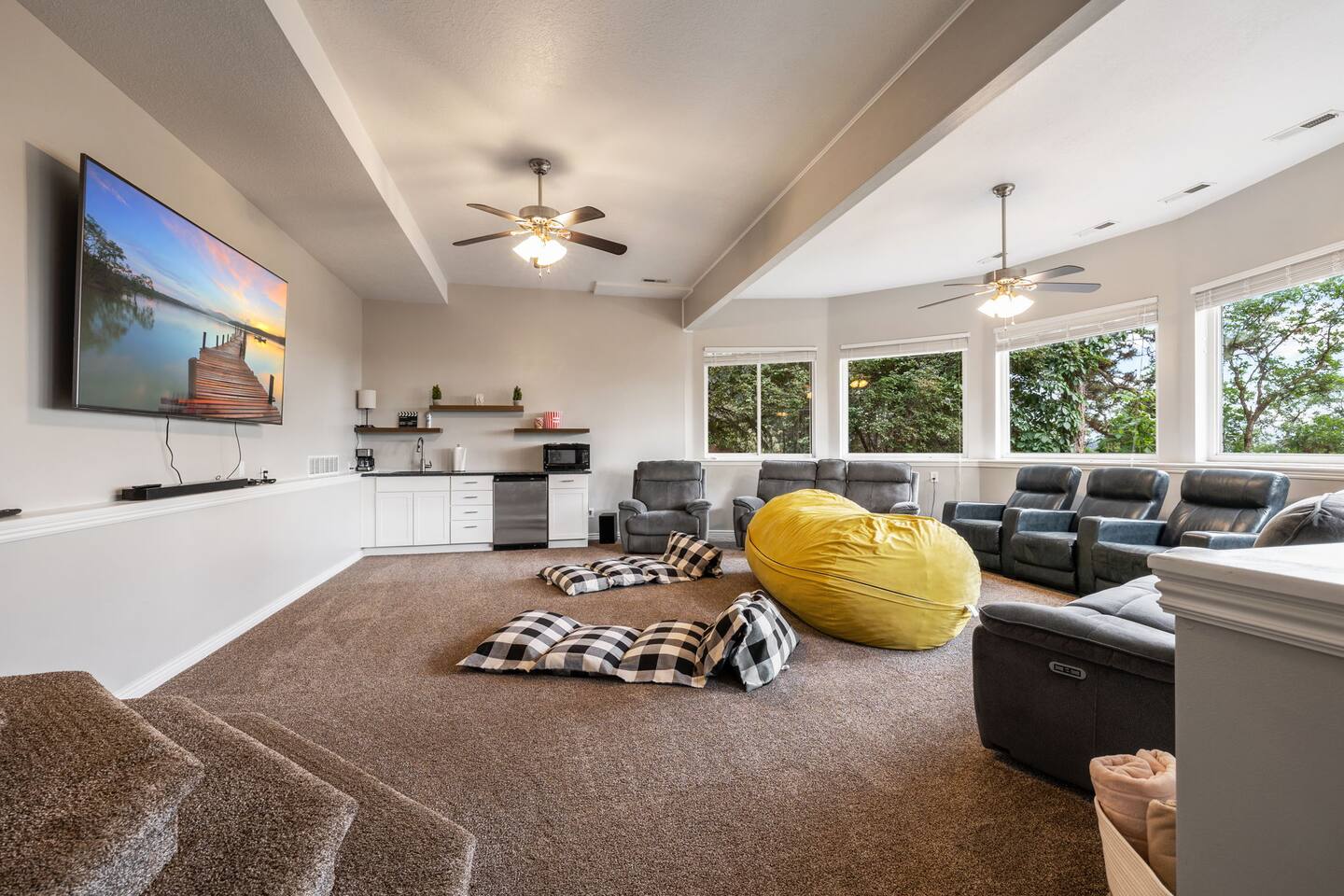 Living Area & Kitchen: The kitchen, living room, and dining room are all connected and are the heart of the home for gathering, eating, and creating memories. The kitchen is fully stocked and has an island with seating for 3 people. In the dining room, you will find the dining table that seats 10 and provides access to the garage. The living space has a 85" TV surrounded by a stylish couch and two (2) armchairs. The kitchen is stocked with all necessary appliances including a waffle maker and hot beverage bar. You’ll also find sufficient dish ware and utensils for large groups. Lower level Theater Room with 8 electric recliners and an 85" TV with sound bar, including a wet bar with a microwave, and fridge. You can also have a Karaoke night with your family, enjoy the retro gaming station or play with your kids in the play area. Exterior: The home is situated on a mountainside with abundant native vegetation. Outside the back door there is a small patio area with a hot tub. Separate deck that has a gas grill. Bedrooms: The master bedroom is located on the main floor and has a king bed just off from the living space. There is an attached bath with jetted tub and a separate shower. There is also a desk and two armchairs. On the main level of the home there is one (1) more bedroom with one (1) queen bed and an adjoining bathroom. In the basement there are two (2) large bedrooms, each with one (1) king sized bed and an additional one (1) twin bed. There is also a play area with a triple twin bunkbed. Each bedroom has its own closet. The two basement bedrooms share a bathroom located in between the two rooms. Bathroom(s) & Laundry: On the main level in the master bedroom, there is a large dual sink bathroom with a shower, separate jetted tub, and toilet. There is an additional bathroom with a single sink on the main level. In the basement, there is a single sink bathroom with shower/tub and toilet. There is a washer and dryer located on the main level that is connected to the mudroom as one enters the home from the side entrance. Specific Amenities: The guests will have full access to a 3-car enclosed garage. Wi-Fi Speed: Distances to these local destinations: - Snowbasin Resort -- 23 minutes - Hill Air force Base -- 20 minutes - Weber River -- 10 minutes - Weber State University -- 9 minutes - Ogden Temple -- 16 minutes - Pineview Reservoir - 28 minutes - Antelope Island -- 43 minutes -Salt Lake Airport -- 32 minutes - Park City — 60 minutes (Note: Distance provided by the most popular navigation website)